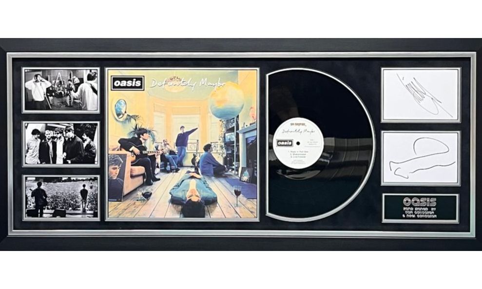 Fabulous Oasis display featuring their “Definitely Maybe” vinyl album mounted alongside hand signed signature cards from both Liam and Noel Gallagher. The display includes a Certificate of Authenticity on the rear of the frame. This would make a fantastic gift for any Oasis fan.