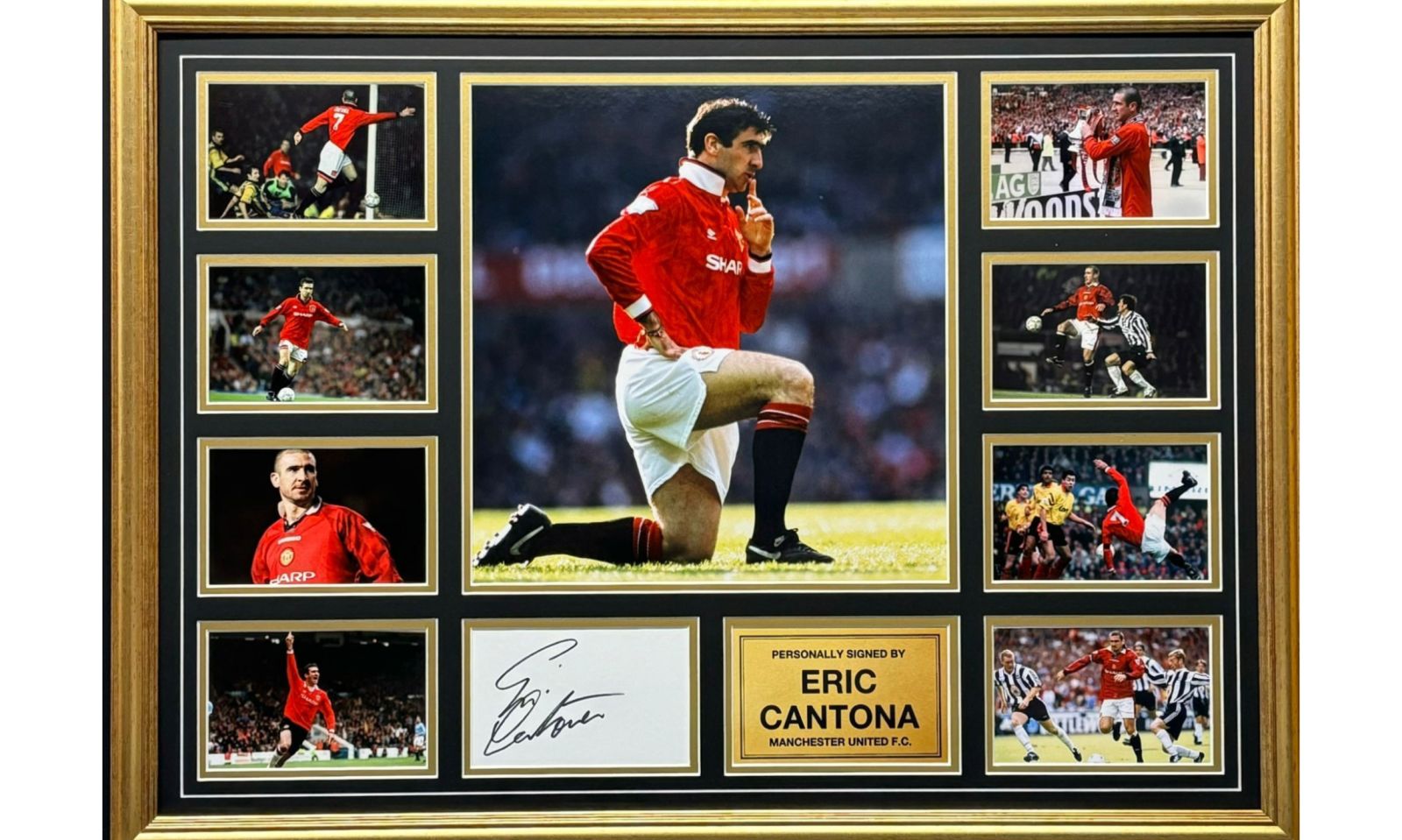 Stunning frame featuring multiple images of Manchester United legend – Eric Cantona. Mounted within this superb display is a hand signed signature from Eric. The display includes a Certificate of Authenticity on the rear of the frame.