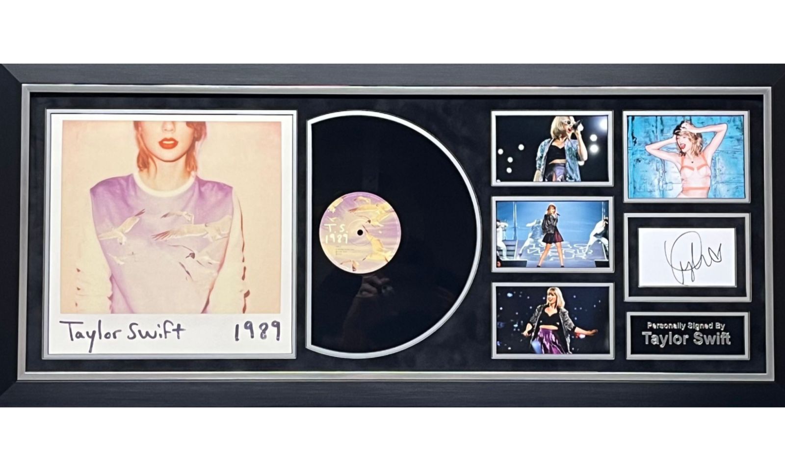 This superb frames features  one of Taylor's vinyl '1989" albums which has been beautifully mounted and framed alongside an original hand signed signature from Taylor.